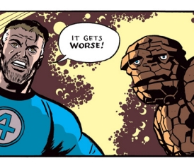 Even more remarkably, Kirby made you care for his outlandish characters. They seemed genuinely broken, brooding, driven, and noble. Reading certain issues of The Fantastic Four when I was 6 was as an intense of an emotional journey as watching The Wizard of Oz. I dreamed of someday working for Marvel and in 2003, I actually got to write a four-issue Fantastic Four miniseries. In tribute to Kirby, I even incorporated some of his actual panels into my story. At the time I had little reservation about working for Marvel. Since then, things have changed.