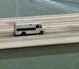 I left the canals of Foster City behind and drove up the back of the bridge on its initial rise, eventually reaching the highest point. When the film cuts from the dim loft interior of the team’s headquarters to a bright aerial shot of the bridge, this is where we find their gray van, rolling and bumping over the bridge’s expanse.