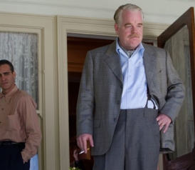 I suspect that this remoteness is intentional, that we’re not meant to be drawn into the inner lives of the Master and Freddie, or to fully comprehend what’s at stake in their slippery, ever-changing relationship. Though the characters they play remain inscrutable, Hoffman and Phoenix are as vibrantly present as they’ve ever been onscreen. Especially in their one-on-one scenes together, we’re aware of them not only as characters but as living bodies, men who might get into a fistfight or burst out laughing or break into spontaneous song at any moment. Phoenix gives Freddie a stoop-shouldered, shambling old-man gait that says more about the hard knocks he’s taken than any war flashback could, while Hoffman leavens his frighteningly intense character—a charismatic, short-tempered narcissist—with periodic bursts of antic gaiety.