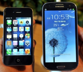 An Apple iPhone 4S, left, and a Samsung Galaxy S3, right