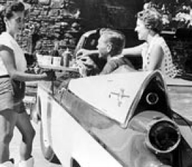 Eating and drinking in (parked) cars became popular with the rise of the drive-in restaurant and theater. In a sense, the tray that hooked on to the partially rolled-up window is the antecedent of the automobile cup holder. The tray was typically located on the driver's door, and back-seat passengers had to put their cokes and malts down on the floor and remember not to kick them over. Eventually, the front-seat passenger was able to open the glove compartment door and sit a glass or cup or two on the door-cum-table. But leaving the drive-in with an unfinished drink usually meant holding the cup gingerly and hoping it didn't spill. Early attempts by carmakers to add grooved depressions to the glove compartment door—like those on airplane tray tables—checked sliding but not bouncing and sloshing.
