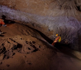 AF: It's like mountain climbing in the dark. We traveled almost a kilometer underground throughout the six nights we spent in this cave. We had to use rappelling ropes and harnesses to move up and down the cave walls.