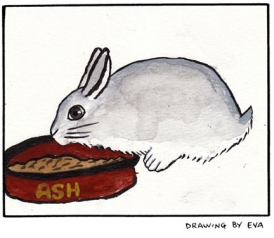 Less than a week later, the mudroom door was left open. Chi Chi jumped up onto the rabbit room door, came down on the door's handle, and the grim business began. Both bunnies were out of their pens but Ash somehow managed to find cover. Chi-Chi snapped Thunder up in her jaw and shook her head vigorously. He died in Rachel's lap a few minutes later.