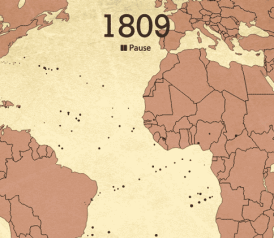 This interactive, designed and built by Slate’s Andrew Kahn, gives you a sense of the scale of the trans-Atlantic slave trade across time, as well as the flow of transport and eventual destinations. The dots—which represent individual slave ships—also correspond to the size of each voyage. The larger the dot, the more enslaved people on board. And if you pause the map and click on a dot, you’ll learn about the ship’s flag—was it British? Portuguese? French?—its origin point, its destination, and its history in the slave trade. The interactive animates more than 20,000 voyages cataloged in the Trans-Atlantic Slave Trade Database. (We excluded voyages for which there is incomplete or vague information in the database.) The graph at the bottom accumulates statistics based on the raw data used in the interactive and, again, only represents a portion of the actual slave trade—about one-half of the number of enslaved Africans who actually were transported away from the continent.