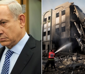 Israeli Prime Minister Benjamin Netanyahu and damage in Gaza city following an Israeli air raid