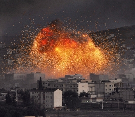 An explosion rocks the Syrian city of Kobane during a reported suicide car bombing by the Islamic State, as seen from the Turkey-Syria border, on Oct. 20, 2014. The small picture is very bad, but the big picture of violence around the world is about as good as it’s ever been.
