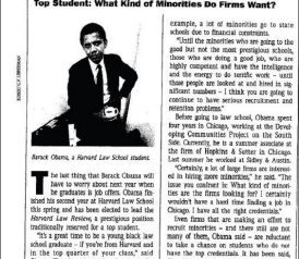 Voters and the press are praising Barack Obama's March 18 speech about race. The Democratic Party front-runner had been reluctant to tackle the controversial topic head-on in his campaign. Back in the summer of 1990, however, a much younger Obama was interviewed for a feature in the Chicago Reporter about the lag in minority hiring by top Chicago law firms. Then in the top quarter of his Harvard Law class, slated to lead the prestigious Harvard Law Review, and a summer associate at Hopkins & Sutter, he told journalist David Rubenstein, "I certainly wouldn't have a hard time finding a job in Chicago." It was different for less-credentialed minority students, Obama said. He noted that "a lot of minorities go to state schools due to financial constraints" and wondered aloud when young minority attorneys would have the same right to be "mediocre" that their white counterparts had (see below).
