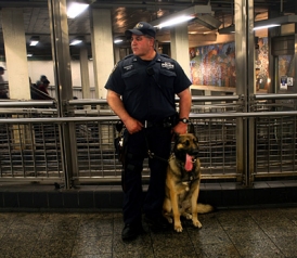 A police officer and his dog, Buster, watch pedestrians in New York City.