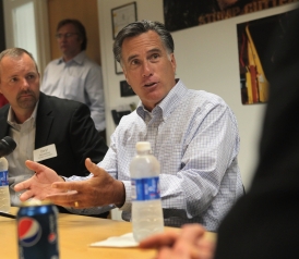 As he toured the Western part of the state, Romney was all business all day. Even in rural areas, he campaigned in his natural habitat, sitting in the ersatz leather swivel chair the end of a conference table of business leaders at a local bank in Treynor, speaking at the Council Bluffs Chamber of Commerce.