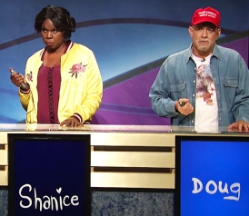 By this point, the message is clear. On this episode of “Black Jeopardy!”, the questions are rooted in feelings of disempowerment, suspicion of authority, and working-class identity—experiences that cut across racial lines. Thompson and the guests are black, but they can appreciate the things they share with Doug, and in turn, Doug grows more and more comfortable in their presence, such that he gets a “pass” from the group after he refers to them as “you people.” That moment is funny, but it also foreshadows the end of the sketch, where this message of commonality—even solidarity—is tweaked and made more complicated.