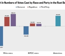 Democrats also lost the black, indigenous, and other people of color (BIPOC) vote in the Rust Belt 5, with 400,000 fewer voters in this category (-11.5 percent). While disaggregated exit-poll data on BIPOC voters was inconsistently available across the five states we examined, in those places where numbers were available, Democrats saw losses among both black American and Latino voters. Importantly, some of the greatest losses in BIPOC votes were in states such as Ohio and Wisconsin, both of which adopted voter suppression laws beginning in 2012. But even in states with no such laws, such as Pennsylvania, BIPOC turnout was significantly lower this election cycle. In short, more people of color stayed home in the Rust Belt in 2016 than in 2012.