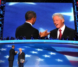 Clinton also launched full defenses against Republican attacks on Obama's Medicare plans and the welfare waivers his administration has approved. "I didn't know whether to laugh or cry," he said in one of the few asides that wasn't ad-libbed. (As you noted, Dave, Clinton spread ad-libbed material like grout throughout his remarks.) He also made a broader critique of the modern Republican Party, arguing that it was in the thrall of its most conservative elements. He lauded both Bush presidents and President Eisenhower in an attempt to shame current Republicans for their obstructionism and in a political bid to woo swing voters. He seemed to be trying to stir some life in the post-partisan pragmatic vision that Barack Obama had offered in 2008 by saying that despite all of the recent bitterness, Barack Obama was still committed to trying to work with Republicans who practiced that old strain of cooperative lawmaking.
