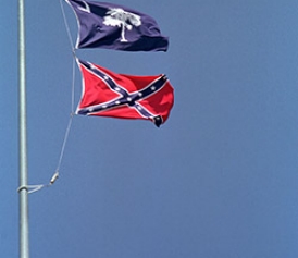 Is it any accident that they fly Confederate flags from their statehouse, as in South Carolina, or incorporate Confederate flag symbols into their state flags as in Mississippi and Alabama, or allow them to be flaunted on state-issued license places, even passing laws that declare they must be respected. If you’ve traveled much in the South (as I have), you see them flying too from courthouses, municipal buildings, and other private establishments. If it’s not unconstitutional, it is, frankly, disgusting.
