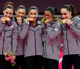 So the Fab Five did it: They took home the gold in women’s gymnastics team finals for the first time since 1996. They won decisively over Russia—their main competitor—in a series of gorgeous, almost entirely rock-solid routines and vaults, ending up 5.066 points ahead. (That’s a lot these days.) I wonder if everyone else watching the proceedings in America felt as good as I did. The whole thing was in sharp contrast to Monday’s disastrous performance by the men’s team, which had John Orozco shaking with suppressed tears at one point. (I literally felt sick to my stomach watching him and Danell Leyva; their distress was so palpable. And Leyva is a beautiful gymnast.) The win also made up for the sickening fact that Jordyn Wieber, who placed fourth in team qualifying, won’t be able to compete in the individual all-around because of the rule that only two gymnasts per nation can compete. (More on this later.)
