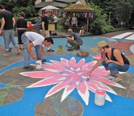 I visited Portland on the spring day when the piazza was getting its annual new coat of paint. There were cans and brushes and kids all over the street, smearing the asphalt with coats of electric pink, turquoise, and leaf green. There was Wayne, a homeless bottle collector, pausing for a smoke and a chat on the cob bench the villagers had built, with Pedro Ferbel, the guy who built a community sauna in his backyard.