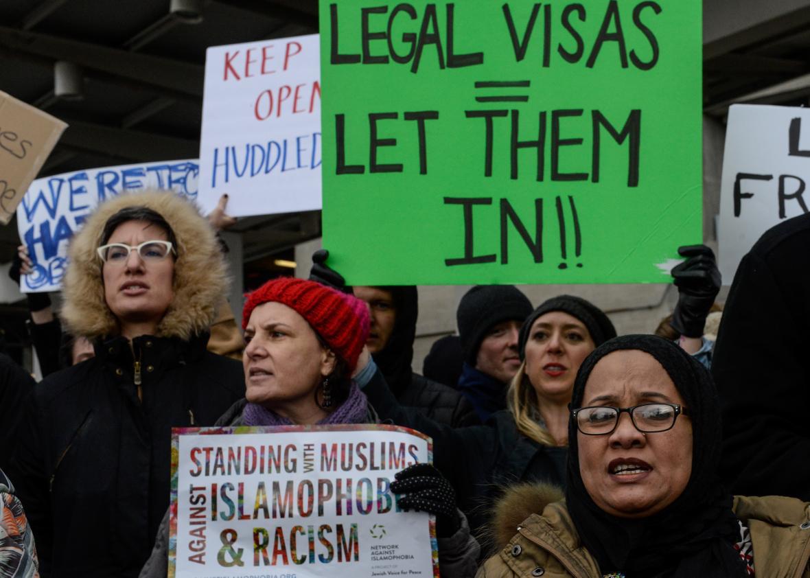 As of Saturday afternoon, Alshawi is still being detained at JFK. He is one of multiple refugees—the government won’t say how many there are—with valid documents who is nevertheless being held at an airport. (Update, Jan. 29, 2017: Alshawi was released Saturday night.) Trump’s expansive executive order prevents refugees, migrants, and even green-card holders from seven Muslim-majority countries from entering the U.S. (Reuters reports that green-card holders may be evaluated on a case-by-case basis.) The government’s interpretation of the order has led to the immediate and indefinite detention of people who, until Friday, had every right to come into the country.