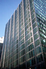 ![]() Federal Center, by Ludwig Mies van der Rohe Mies himself designed the Federal Center, constructed over the period 1959-74. The conventional view is that these glass boxes are absolutely minimal. Samuelson sees them differently. He points up at the I-beams on the skin. Though these girders serve a function as "stiffeners," they aren't a structural necessity. |